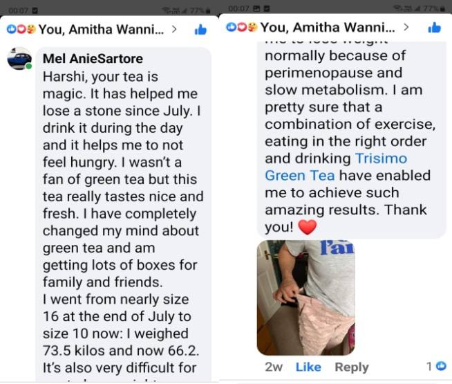 Testamonials from our customers tells a great story about Trisimo tea. How it has benefited them in maintaining a healthy lifestyle, how lovely it is to drink as it has a great taste to it which is not bitter. And also how it helps to get in shape by being a fat buster. What else do you need..